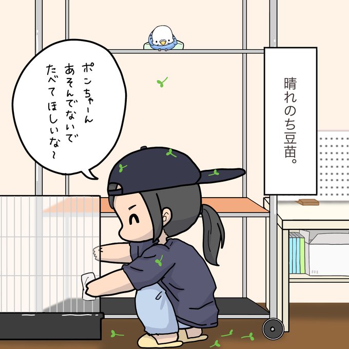 今日の天気は『晴れのち豆苗』🌱 #イラスト #セキセイインコ #4コマ漫画 #誤植修正し再アップ🙇♀️