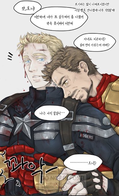 근데 토니가 조용히 껴안고 아무말도 안한채 펑펑 울면 좋겠다 토니도 머리로는 알겠지 마음같아서는 집에 가둬두고 위험한 일 하나도 못하게 다 막아버리고 싶고 이미 70년전에 얼음에 처박혀서 희생한것으로 스티브는 할일을 다 한거 같은데 뼛속까지 정의맨(..)인 스티브를 자기 마음대로 할 수도