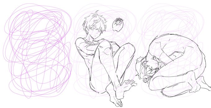 以前近所のカフェにいた画家のおねーさんが「アイデアが浮かばない時はぐちゃぐちゃに線を描いてそれを見てるとインスピレーションが湧くよ🧑🎨✨」て言っててほんまかいな🤔てやってみると意外と描ける✌️全員全裸のモモくんになるが…