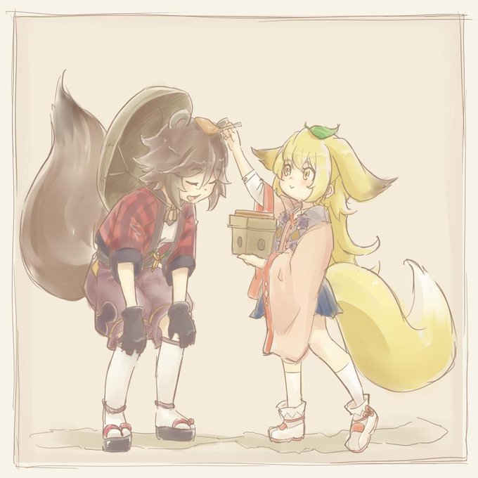 ろんちゃさんリクエストのおあげちゃんとたぬ子ですっ🥰 葉っぱもらったのでお返しにお揚げをあげようね😊 #ファイトリーグ