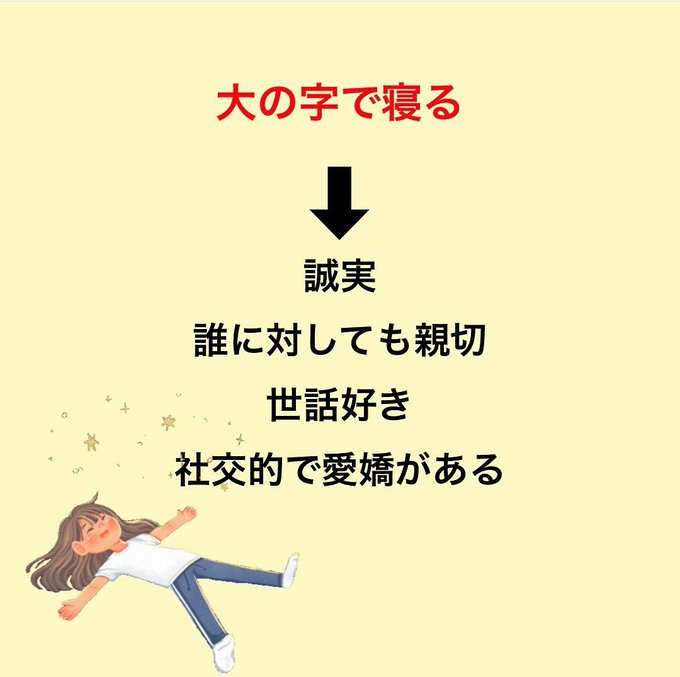 へぇーってなった💡 当たってるんかな…? さわたり→大の字 マエム→横向き こわたり→うつ伏せ