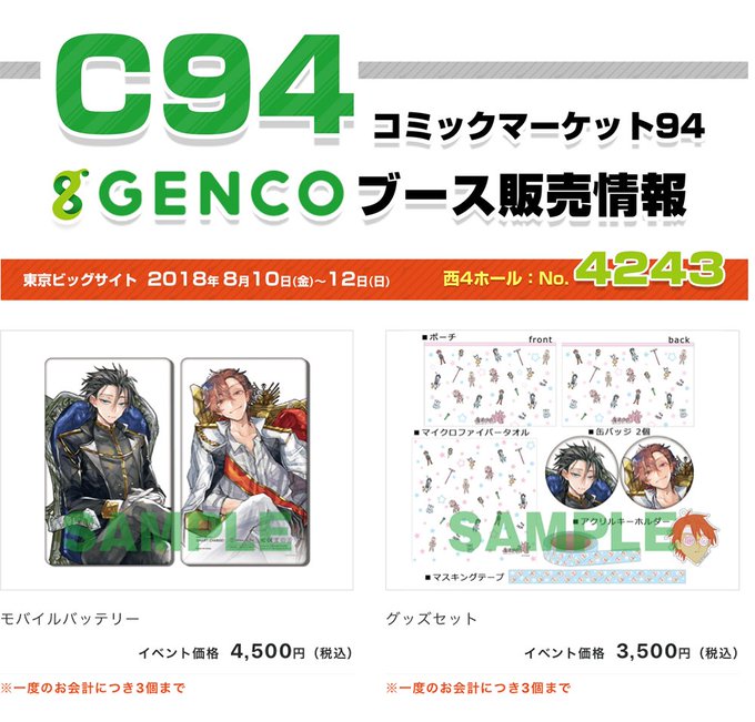 8/10(金)~8/12(日)開催 #コミックマーケット94 GENCOブース(西4 No.4243)にて、下記グッズの販売が決定しました!