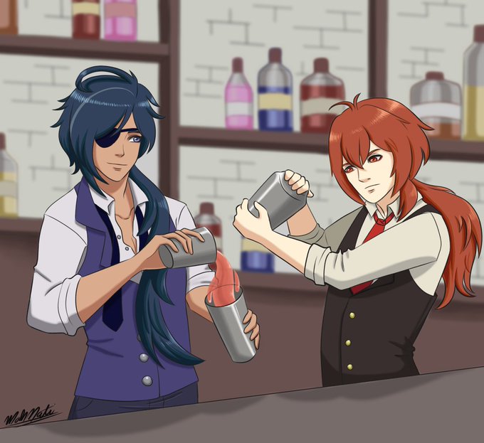 Commission for @Nicoffeeart, who asked for Kaeya and Diluc in a #GenshinImpact modern AU, working as bartenders. This was super fun to draw, thank you! 🥰