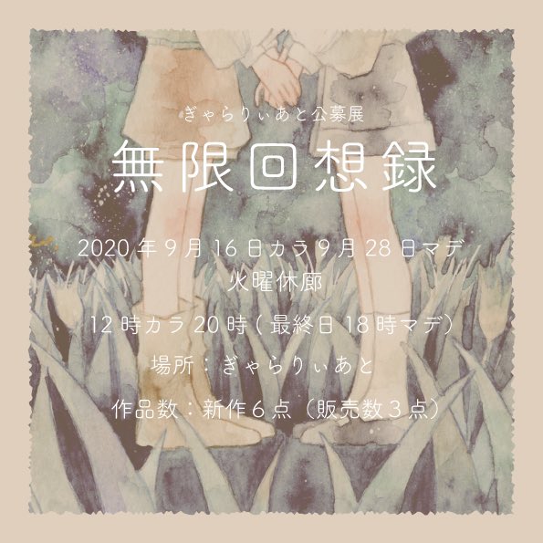 【 展示のお知らせ 】 ぎゃらりぃあと様の9月公募展「無限回想録」に参加いたします。 「本」がテーマの展示です。 どうぞよろしくお願いします。