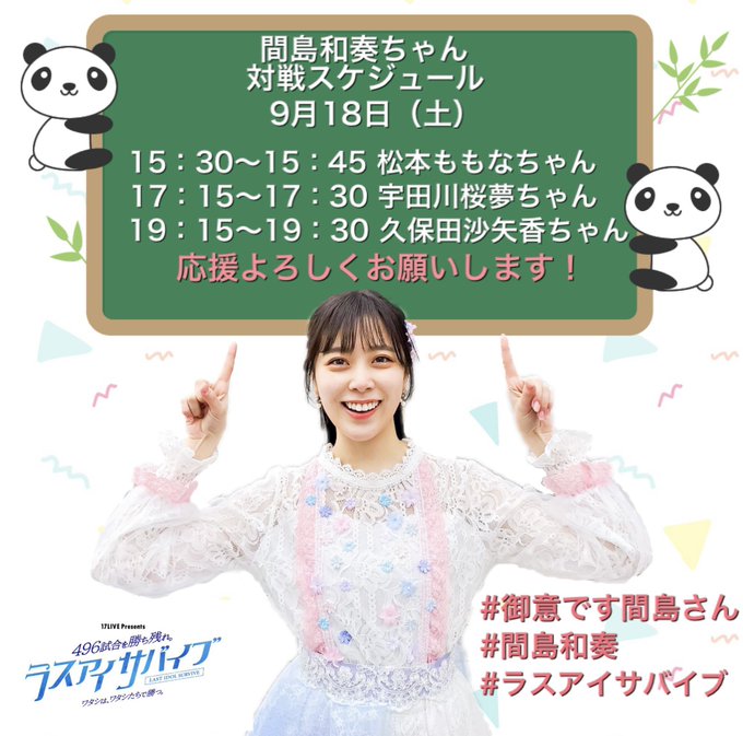 明日18日(土)から #ラスアイサバイブ ラスト3日間となります!! とりあえず明日の時間↓ 9/18(土) ①15:30〜15:45 ②17:15〜17:30 ③19:15〜19:30 最後まで頑張ります〜! 応援してくださるととってもとっても嬉しいです☺️💕 よろしくお願いします!! #ラストアイドル #間島和奏 #御意です間島さん
