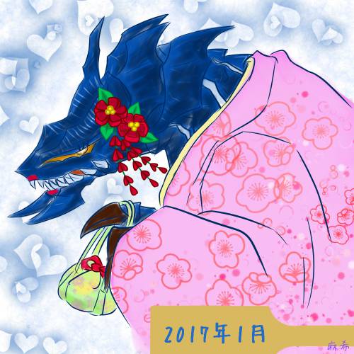 お正月ドゥレムさん。 羽子板イベント、新規の羽子板武器が出てない様子なので、ショックで描きました。毎年楽しみで、2017年は新キャラのゼナちゃんかなぁとか妄想していたら…!特に忙しそうだったし、余裕が無かったのでは…と心配になりました。
