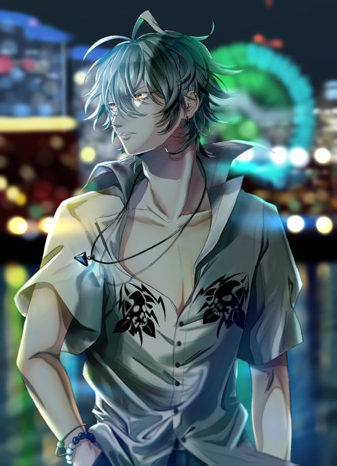 不知ちゃん(@F_c_x9)の左馬刻様線画塗らせてもらいました…!!神線画すぎて塗るのめっちゃ楽しかったですありがとう😭ハマの夜風に吹かれてそうだな〜と思って勝手に背景も付けさせてもらいましたごめん…😇お納めください😇