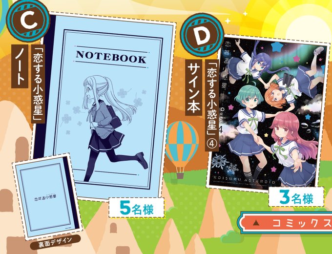 読者プレゼントには「恋する小惑星」ノートとサイン本をご用意しました、ぜひご応募ください♪