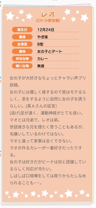 女の子好きのちょっとチャラい声プリ妖精。足が速く運動神経がとても良い。世話焼きな兄マオを煙たく思うこともあるがマオの作るカレーが一番好きだったり🍛