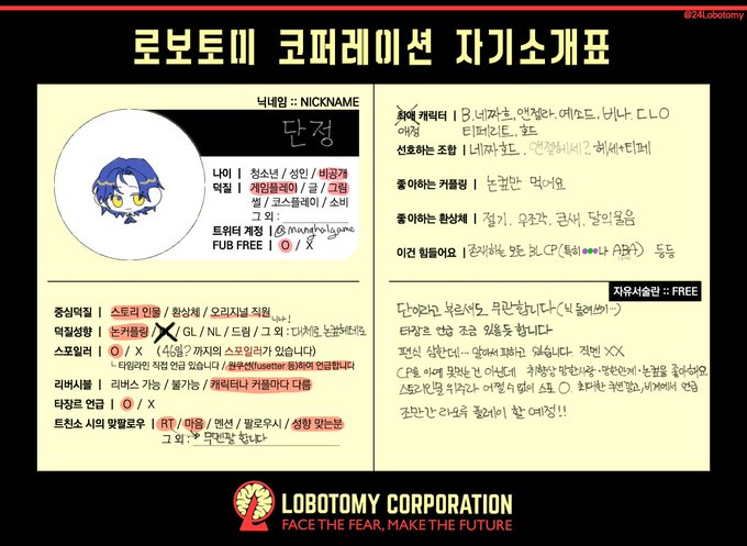 #로보토미_트친소 게임 쫌쫌따리 진행하고 있구 그림도 쫌쫌따리 그리고 있습니다 ~~~ 스토리인물 위주 덕질이에요 더 자세한 건 트친소표 확인해주세요 흔적 남겨주시면 성향 맞는 분 위주로 무멘팔하겠습니당