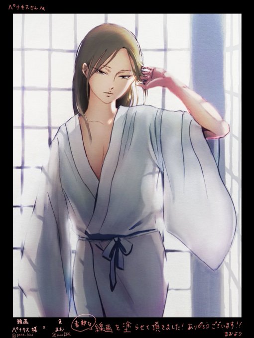 お寝坊した午前の光の中の陸奥も、明け方の曙の中の寝起きの陸奥も、まさにこれから長い夜が始まる夕方の陸奥も捨てがたくて迷いに迷ってめちゃくちゃお待たせしてすみませんでした🙏💦 最終的に真っ昼間なのに着崩れた寝間着サイコー!!というところへ着地しました💕ペナキスさんの線画素晴らしい