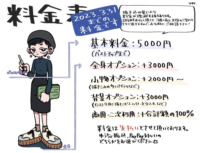 🌷ご依頼について🌷 いつもありがとうございます!まおちです🙋🏻♀️ 2023年4月1日より、料金改定を行います!(2枚目参照) ご不便をお掛けして申し訳ありません、ご了承下さい🙇🏻♀️ 質問、お問い合わせ等お気軽にリプライ・DMにてお待ちしております。 色々ホームページこちら👇🏻 https://t.co/cDi1dDrbJe