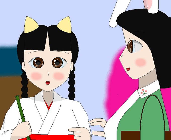 【創作絵】令和 4年 3月 5日にピクシヴに投稿した創作キャラクタ・ #堀北真希うさぎ(右)と巫女をやっているねこ耳の美香ちゃん(鈴木美香・左)。
