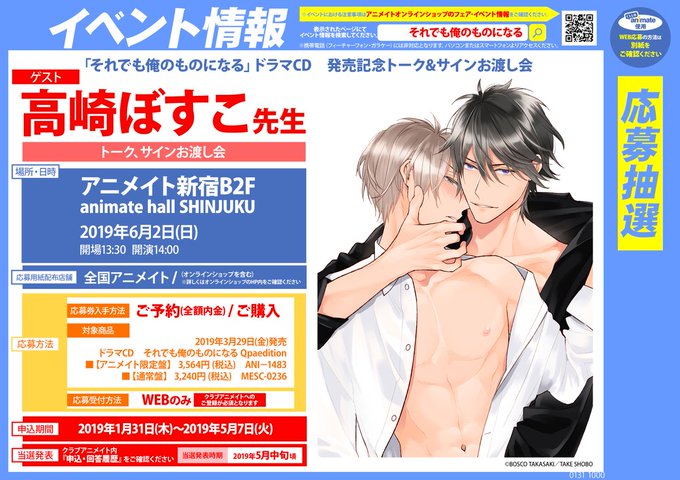 【5/7締切!!】ドラマCD「それでも俺のものになるQpa edition」発売記念★6/2に開催される、「高崎ぼすこ先生のトーク&サイン会」の応募は、「2019年5月7日」です…!お見逃しなく…!
