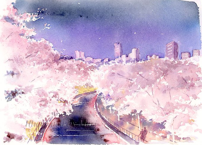 味の素化粧品JINO https://t.co/rfiJ5Ybdjz のお客様プレゼントの2019年カレンダ−4月の絵です。夜桜なんてほんと縁遠いので、故に何か浪漫を感じて描くことが出来ました♪