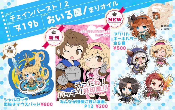7月3日トレ魂#003のChain Burst 2のお品書きです…!とても薄いですが新刊と、アクキー新作とマウスパッドの再販をもっていきます(・θ・)