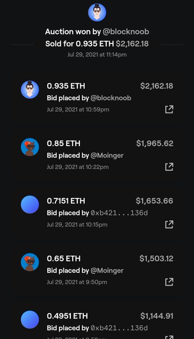 This turned out so unexpectedly and so amazing.. Watching this auction was incredible!! I want to say thanks to @BENDAVE90283164 for starting the bid and continuing to participate through out the auction.. And also @BenMoinger for his bids.. And finally @blocknoob_ for winning 💜