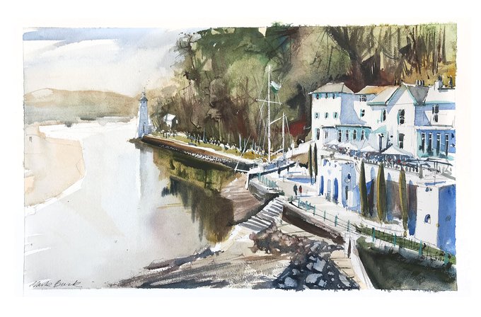 Painting plein air in Portmeirion. Very hot so I have found some shade. Everyone is outdoors and the Hotel is bustling. painted on Saunders Waterford. #watercolor #portmeirion #sea #Wales