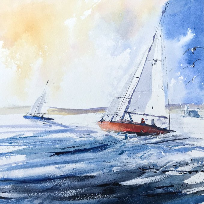 Yacht on a port reach in the solent in a rather brisk westerley. Acrylic on Saunders Waterford paper using Golden acrylics. #isleofwight #yacht #seascape #sailing
