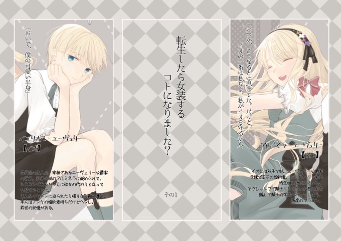 固定ツイにある長編小説『転生したら女装するコトになりました?』の主人公。始まった当初は十四歳。ミュールズ国現宰相エーヴェリー公爵の嫡子。白金色の髪に少しだけ濃い蒼い瞳。穏やかで優しい性格の持ち主。