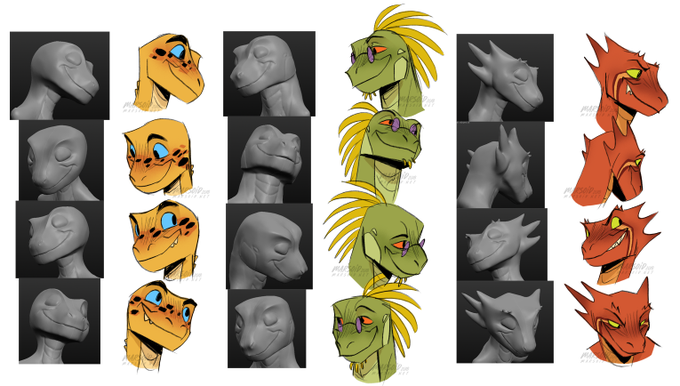 was havin trouble w their head shapes the other day n remembered i could just sculpt em for reference. so here's lots of lizard heads. hell yea