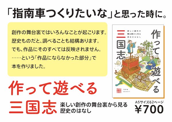 新刊『作って遊べる三国志』は創作時の「調べ物」をテーマに、第一章「指南車と科学、あるいはマジック」、第二章「李典が本棚から書物を取り出すまで」のカオス構成でお送りします。通販もしますよ。A5/62p。