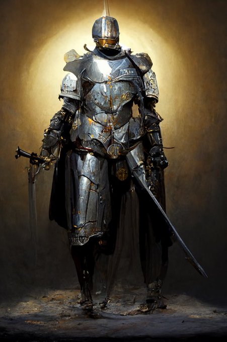 “Concept art of a medieval armored knight, Filippo Negroli armor style. Hyper-realistic. A ray of bright light shines through the dark silver lighting.”