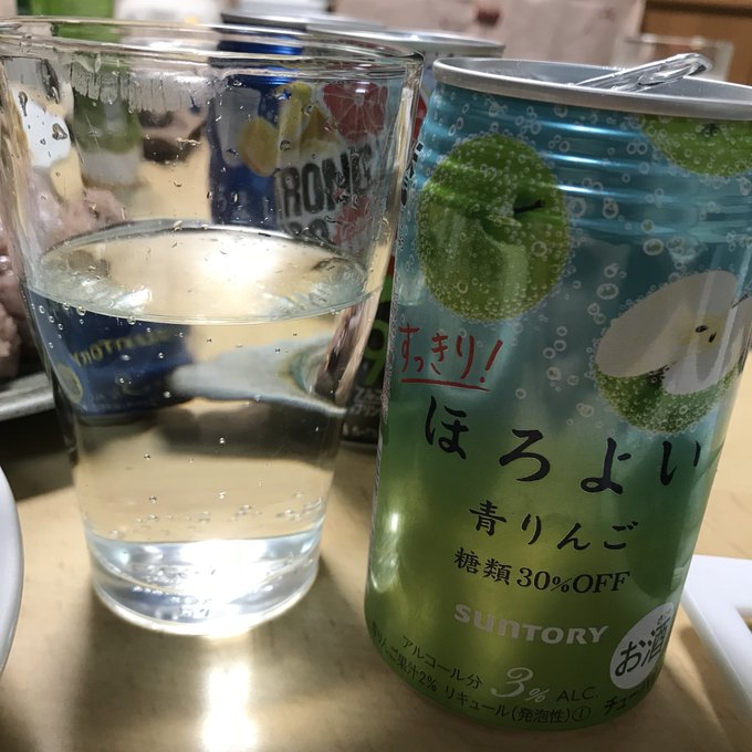 おばあちゃんに飲も言われて飲んでみました。青リンゴ美味しいです。お酒たまに飲んでも全然酔わへんけどやっぱ味ビミョー🤟