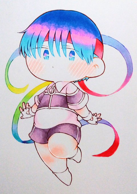 ①最初にアナログでマーカー塗り始めたときはあまり髪色とか深く考えずにグレーで塗ってて ②③「ファンシーな淳くん描きたいな~」と思って髪を明るい水色とピンクのグラデで塗ったのがきっかけで ④あるとき濃い青と明るい水色の間に青みピンクを挟んだら最高に可愛かったのでこれで勝負してます!