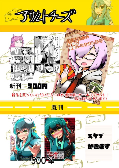あとコピー本はそんな刷ってないんで先着何名かに配ります。あとスケブも新刊を買って頂いた方には、描かせていただきます。よろしくお願いします。