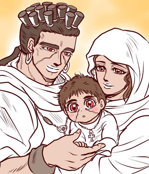 アヴドゥル一族の家族写真を妄想して描いてみました。モハメド生後3か月。民族とか宗教とかあえてあんまり考えないようにはしましたw 兄弟がいるのかどうかもほんと謎だよアヴドゥルさん。
