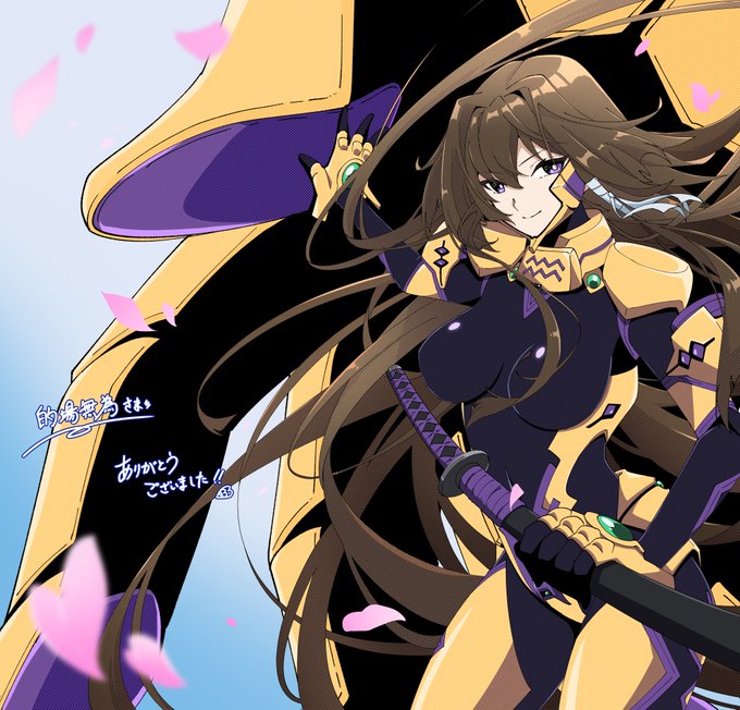 "Anytime!"的なノリで、戦術機の掌上からお礼に笑顔で応えるうちのデジデリウス愛中尉のお姿。衛士強化装備に包まれた姿態を照らす後光の如き明かりが、色気満点の頼れる姐さんを女神のように魅せていて、最高に素敵です。先生、本当に有難うございました! #Skeb