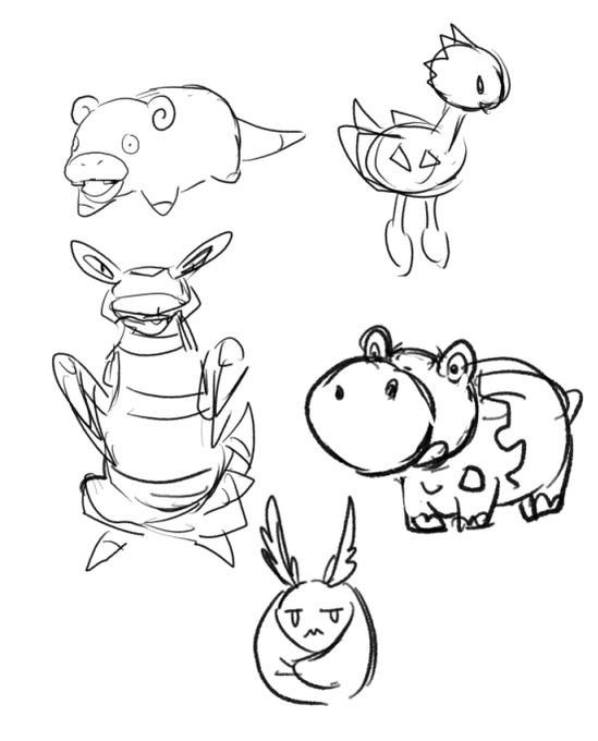 せつこはヤドン、トゲチック、アーマルド、ヒポポタス、クルマユ を何も見ずに描きましょう。頑張って!