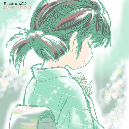宵闇に着物姿でかがむ図が送り火の印象に感じるため、賑やかしに枠右上に謎の飾りを置いてます