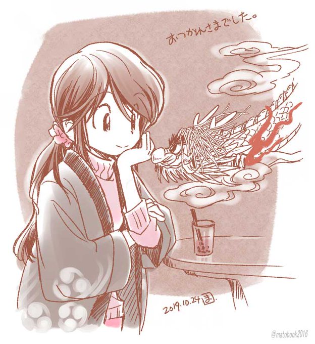 時期が早いかなと思いつつ秋の季語を重んじて紅葉を配置 水の表現に雫や浮き葉を考えるも、ふてくされてる印象になり龍神にそんな感情はなかろうなと変更 水紋へのペン入れを迷いつつ "気" が潜んでいる印象も狙って塗りのみに 雲はやがて戻る場所として置きました