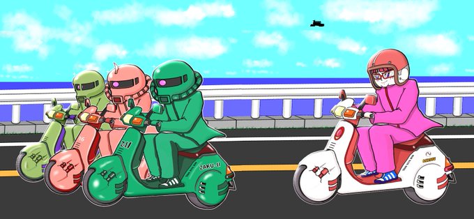 オペレーター「敵のモビルスーツ3機を発見!!ツーリングを楽しんでいる模様です!!」 ブライト「確かGW期間中は休戦協定を結んでいるはずだ」 #シャア専用ザク #ザク #旧ザク #イラスト #ツーリング