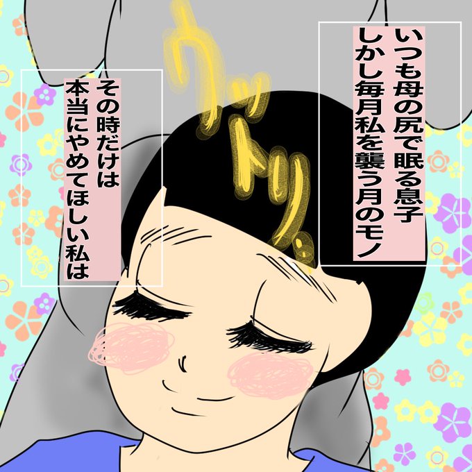私の尻を枕にしか寝られない息子の話。せめて、あの日だけは尻を死守したい母。決死の攻防です。朝までしっかりガード(尻で寝られても蒸れない日用)みたいなナプキン欲しいわ…(続く)