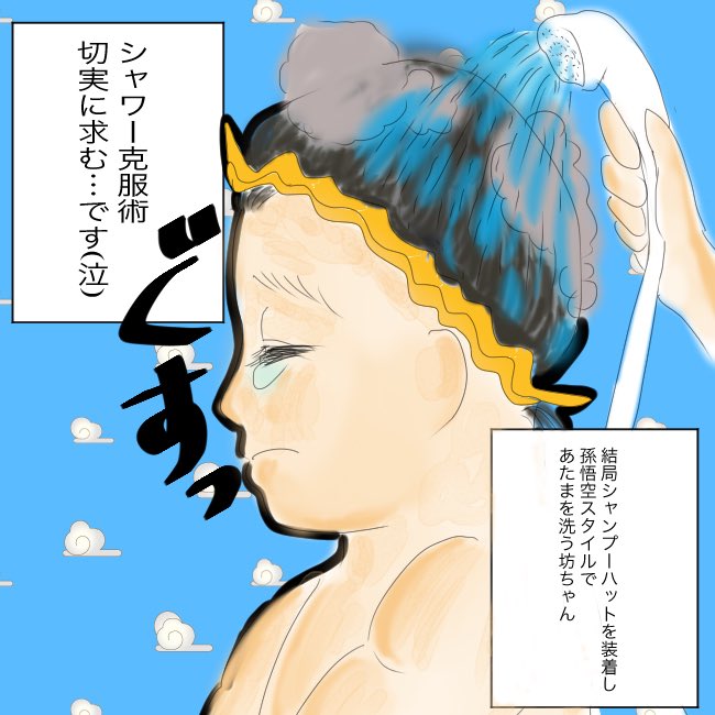 掛け湯で絶叫しシャワーで溺れる2歳8ヶ月。結局シャンプーハット必須。どうやってシャンプーハット卒業したらいいですか?😭😭😭