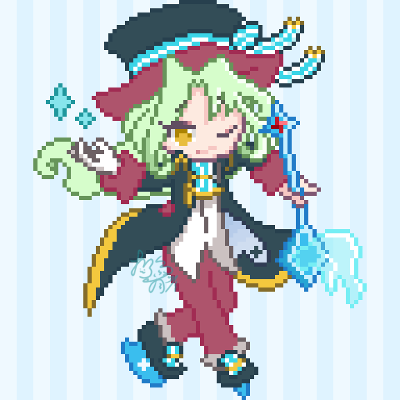 毎日ドット絵投稿チャレンジ152日目 今日は氷の日なのでトラップ職人のサンス! 「★5カード絵の柄杓の持ち方、持ちづらそ〜」と思いながら打ちました ★6や★7みたいにしっかり握った方が持ちやすいと思うんだけど……
