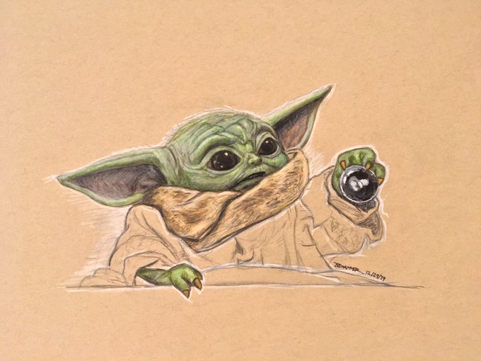 Baby Yoda Illustration - colored pencils on toned paper @JoinTheForce @themandalorian @starwars