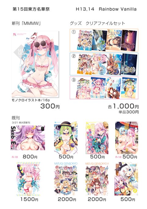 7/18 第15回東方名華祭に参加します~ H13,14 Rainbow Vanillaにて 新刊はモノクロイラスト16ページで300円になります。 厳しい状況が続いてますので、くれぐれも体に気を付けて、そして水分補給をこまめにしてイベント参加に臨みましょう☺️