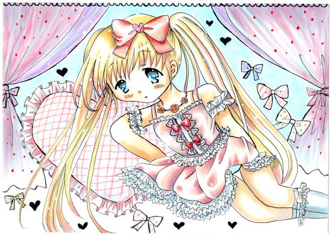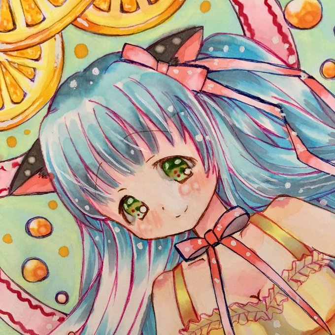 オレンジとリボンに囲まれている猫耳の女の子を描きました🐱