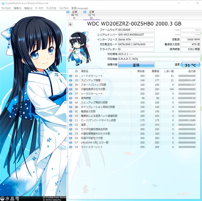パソコン、CrystalDiskInfo様にてチェックするもSSD100%、HDD正常でハードの問題ではなさそう。