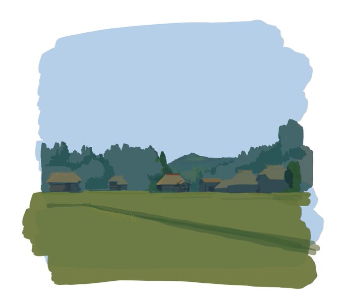 しろほしさん@ouyuhao に刺激を受けて、背景描き始めましたー。最初なので、時間はかかるのしょうがない、数をこなすしかないかな。 勢いで描き始めたから、描き方は書き進めながら情報収集中。 #日々描く #アニメ #背景美術 #田園風景