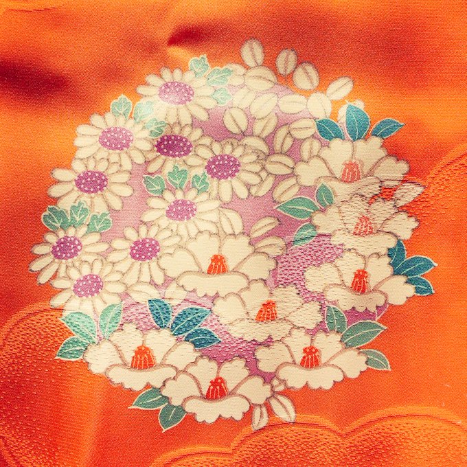 昭和40年ごろ母の七五三のお着物。ポップでハートのような孔雀の羽根、牛車や梅、写ってないところでは扇や竹などめでたいものを詰めとけみたいな絵付けとっても面白い。色遣いが非常に魅力的な子供のお着物👘