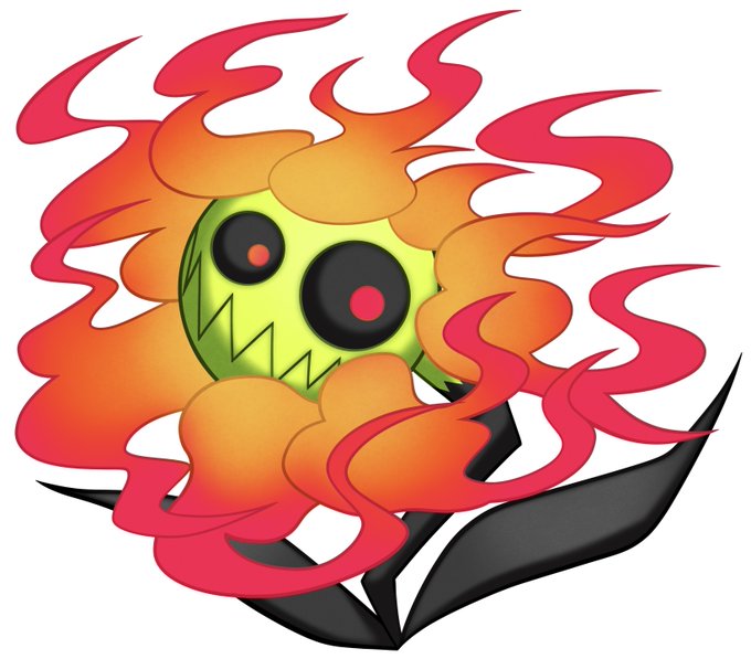 175体目 ヒマワリ 一年中、冷たい風が吹き荒れる雪山に生息している花。その燃え盛る花びらは厳しい寒さの中でも生き延びることができるようにするために進化したもの。凍える雪山ではこの炎はオアシスのような存在で様々な生き物がこの花に集まり暖を取る。 #イラスト #オリキャラ #キャラデザ