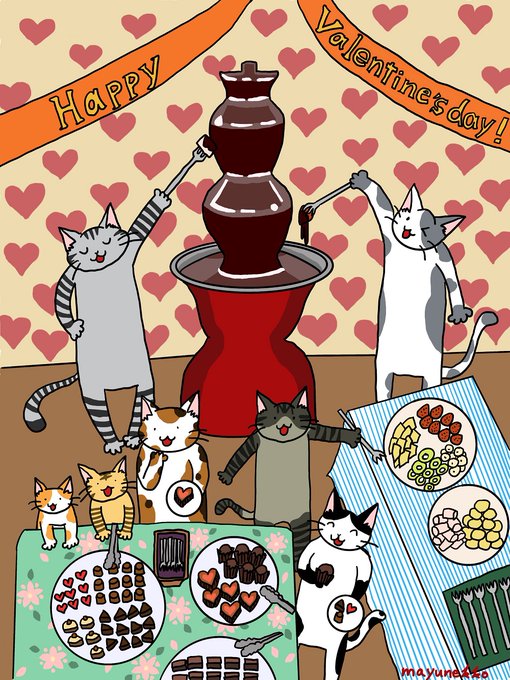 いよいよ明日はバレンタイン!ということで、チョコレートパーティーに興ずる猫のイラスト・・・を描いたのですが、本来、猫にチョコレートは厳禁なので、このイラストは一種のファンタジーとしてご覧下さい。お願いします(_人_)