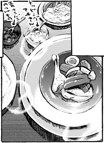 本日開催オンライン同人即売会【グルメ系創作物オンリーイベント】もぐもぐ…ごっくん!!のエアスケブ用に絵を書いてみました! 今からセブンイレブンのネットプリントで試し刷りしてきます! #pictSQUARE #ピクスク #漫画 #カレー #グルメ #同人