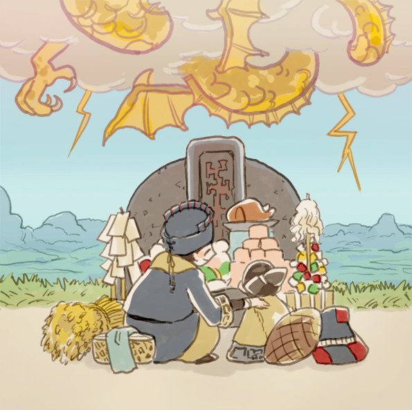 「ありゃね、ドラゴン様の腹の音なのさ」「た、食べられちゃう?」「ふふ、大丈夫たんとお供えしたからね」(雷鳴のドラゴン) #ファンタジー深夜の真剣お絵描き60分一本勝負