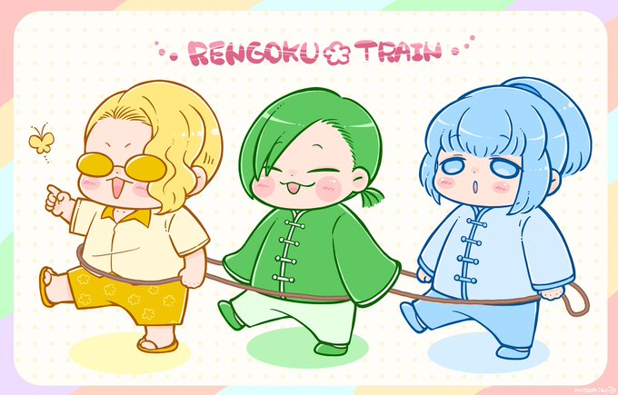 🌟🚃れんごくトレイン🚃🌟 可愛く描けたからグッズにする〜!🤗💕 ドンちゃんを緑にするか紫にするかで迷ってる…🤔 イメージは紫だけど全体見ると緑のが可愛いんだよなぁ😂